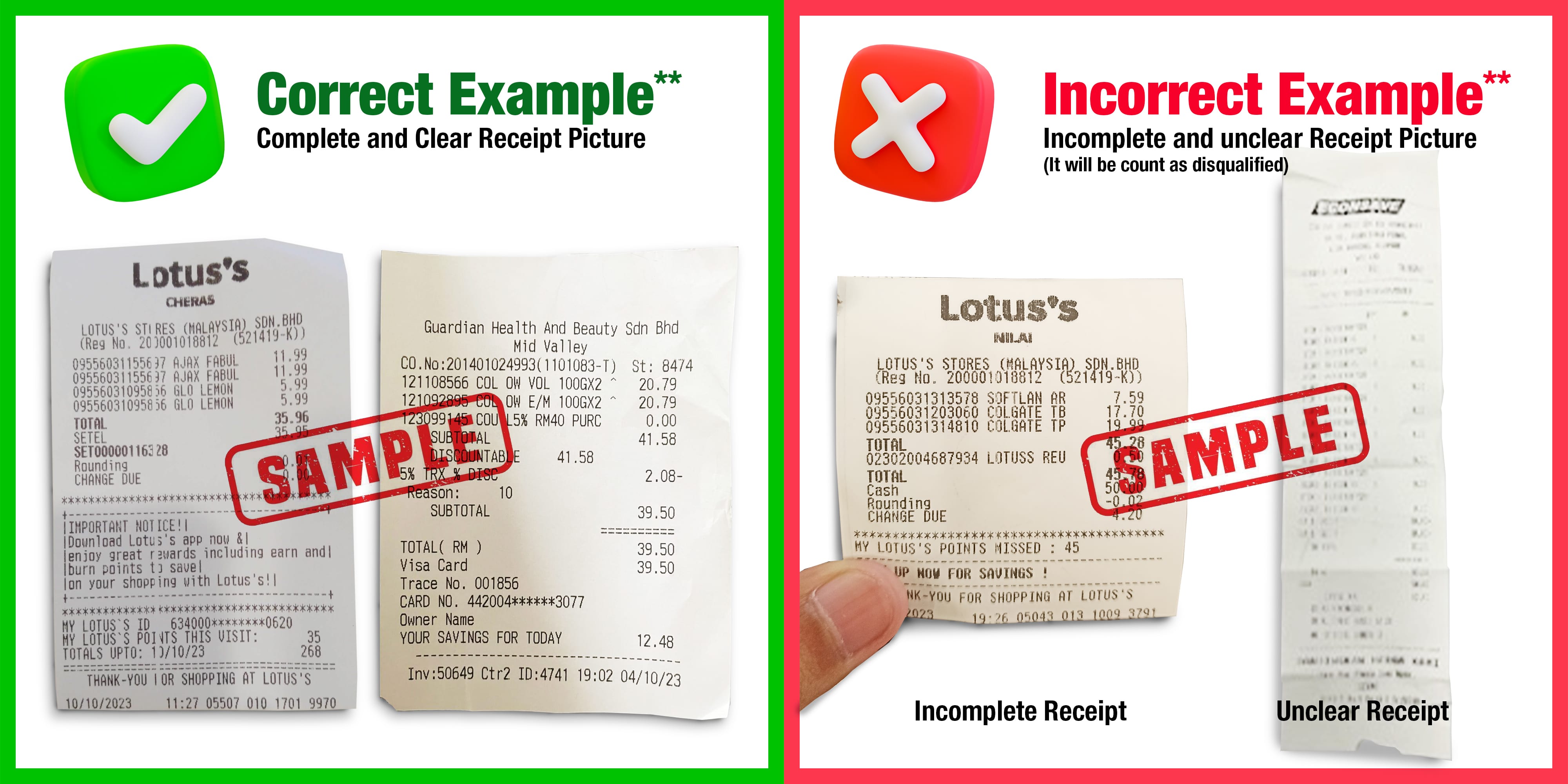 6. Penyertaan yang tidak lengkap (tanpa nama kedai, nombor resit, tarikh), lewat, tanpa Bukti Pembelian yang sah, rosak, tidak jelas atau tidak mengandungi produk yang sah, tidak akan diterima dan tidak layak untuk sebarang penebusan.