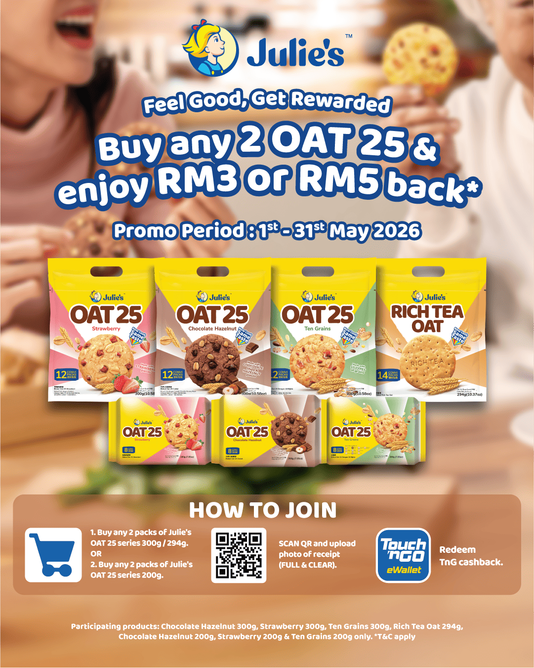 a) Purchase any 2 packs of Julie’s Oat 300g (Chocolate Hazelnut, Strawberry & Ten Grains including Rich Tea Oat 294g) to redeem an RM5 Touch ‘n Go eWallet reload PIN.